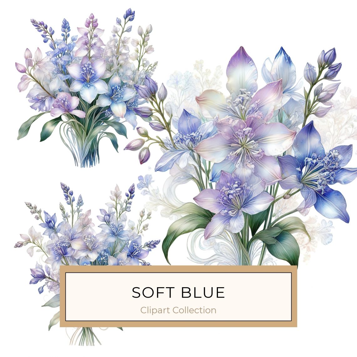 This collection of watercolor blue floral bouquets showcases soft washes and delicate textures, creating an ethereal and serene aesthetic. The blend of lilac and blue tones evokes tranquility, making it perfect for a variety of DIY projects. Ideal for scrapbooking, journaling, and elegant invitations, these floral elements add a touch of sophistication to your creations.