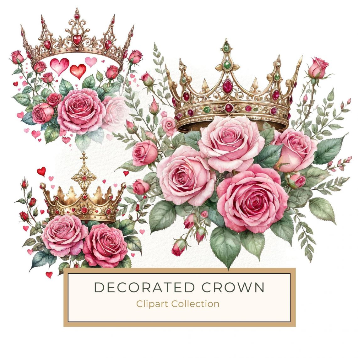 10 Watercolor Crown with Pink Roses and Hearts, Crafting Clipart for Handmade Cards, Scrapbooking, Commercial Use