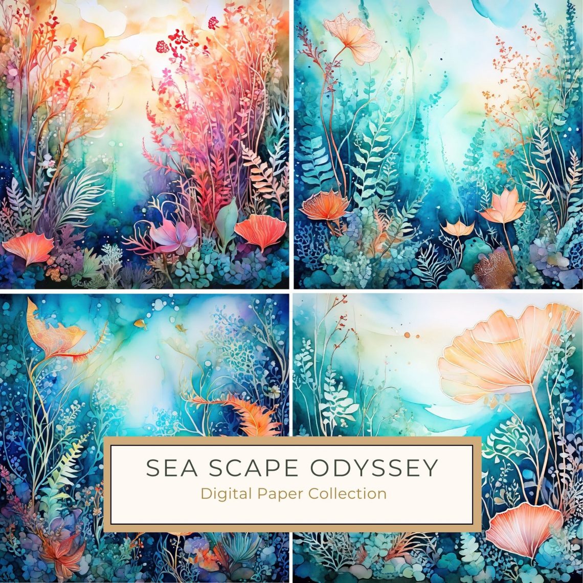 Our Sea Scape Odyssey digital paper collection takes you on a breathtaking dive into an underwater dreamscape. Delicate ferns sway amidst playful seahorses and starfish, all rendered in a mesmerizing blend of aquamarine and coral.