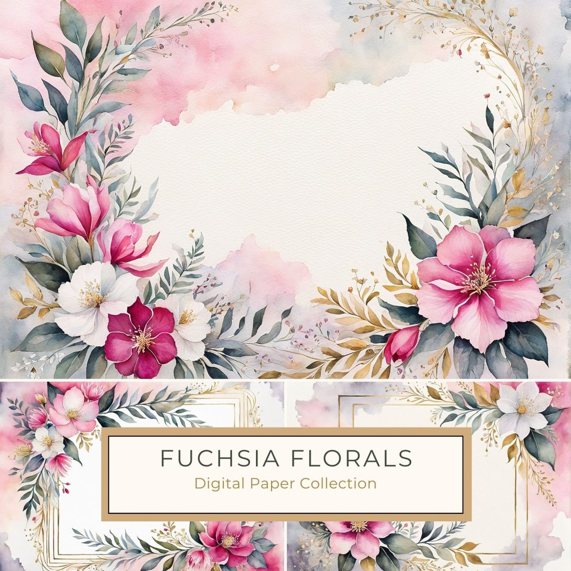 This exquisite watercolor floral digital paper features a lush arrangement of pink and white blossoms with intricate greenery accents. A soft pastel pink and blush-toned backdrop seamlessly blends with delicate gold embellishments, creating an enchanting frame perfect for scrapbooking, wedding invitations, handmade greeting cards, or digital design projects. Its modern yet timeless aesthetic will elevate your creative works, adding sophistication and charm.