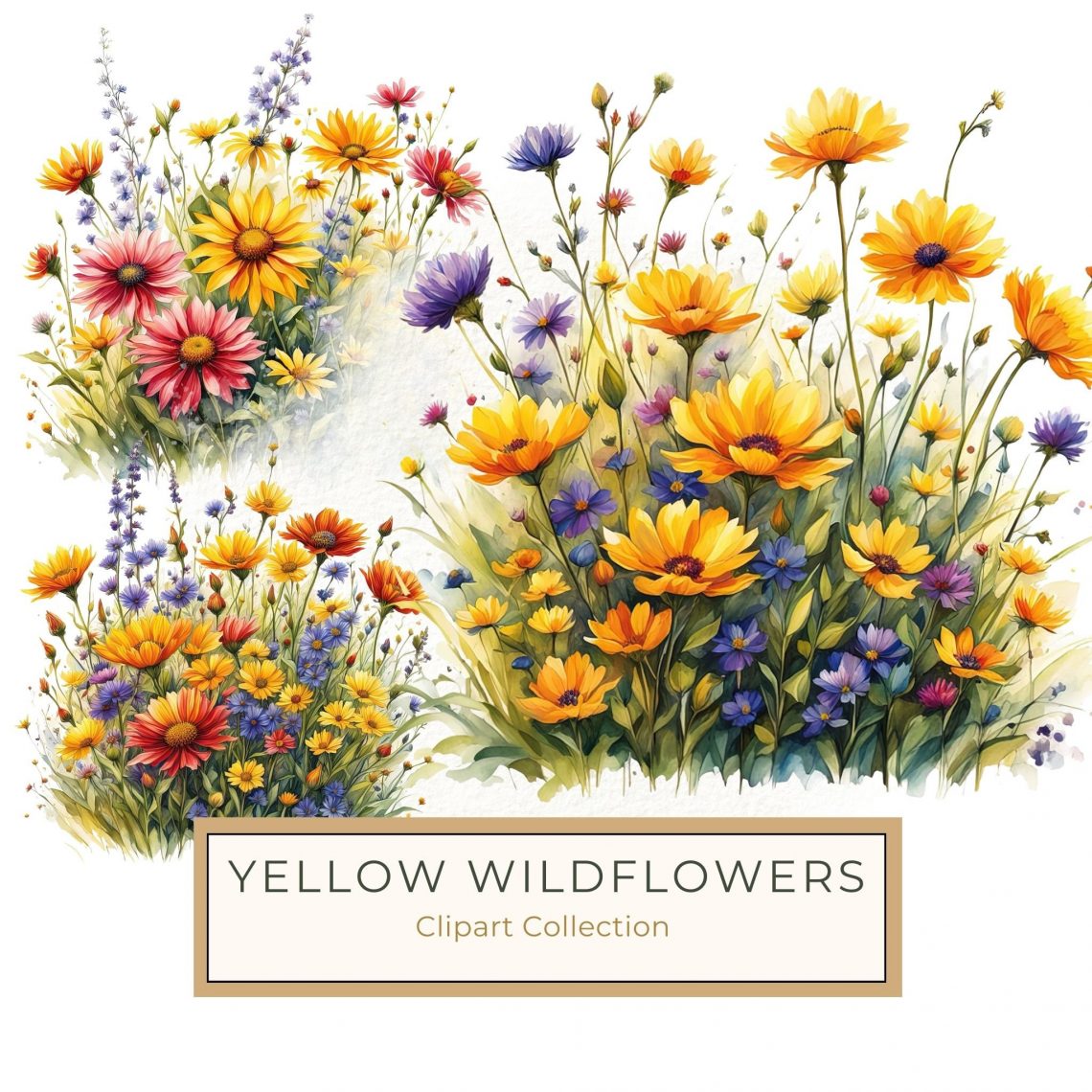 Yellow Wildflower Garden Clipart, Colorful Mix Flowerbed Watercolor Digital Art, Commercial Use, Digital Download, 10 Graphics JPG PNG Files